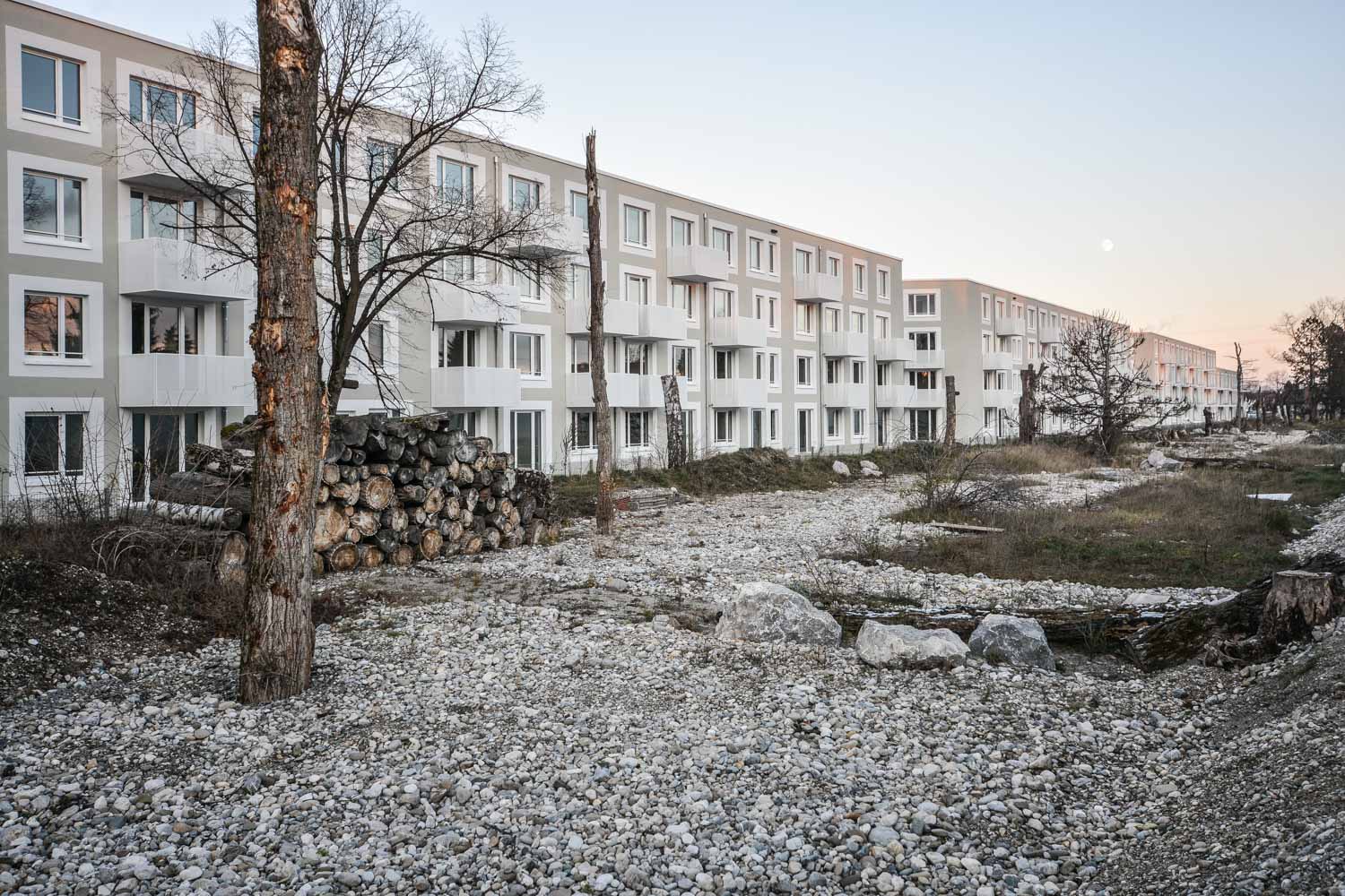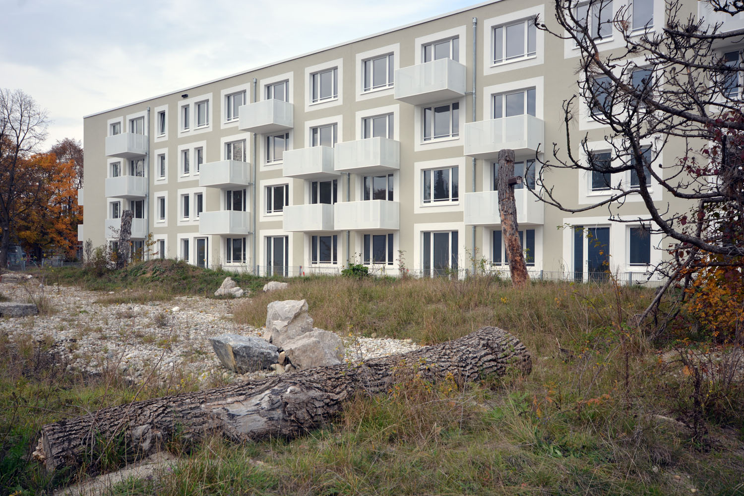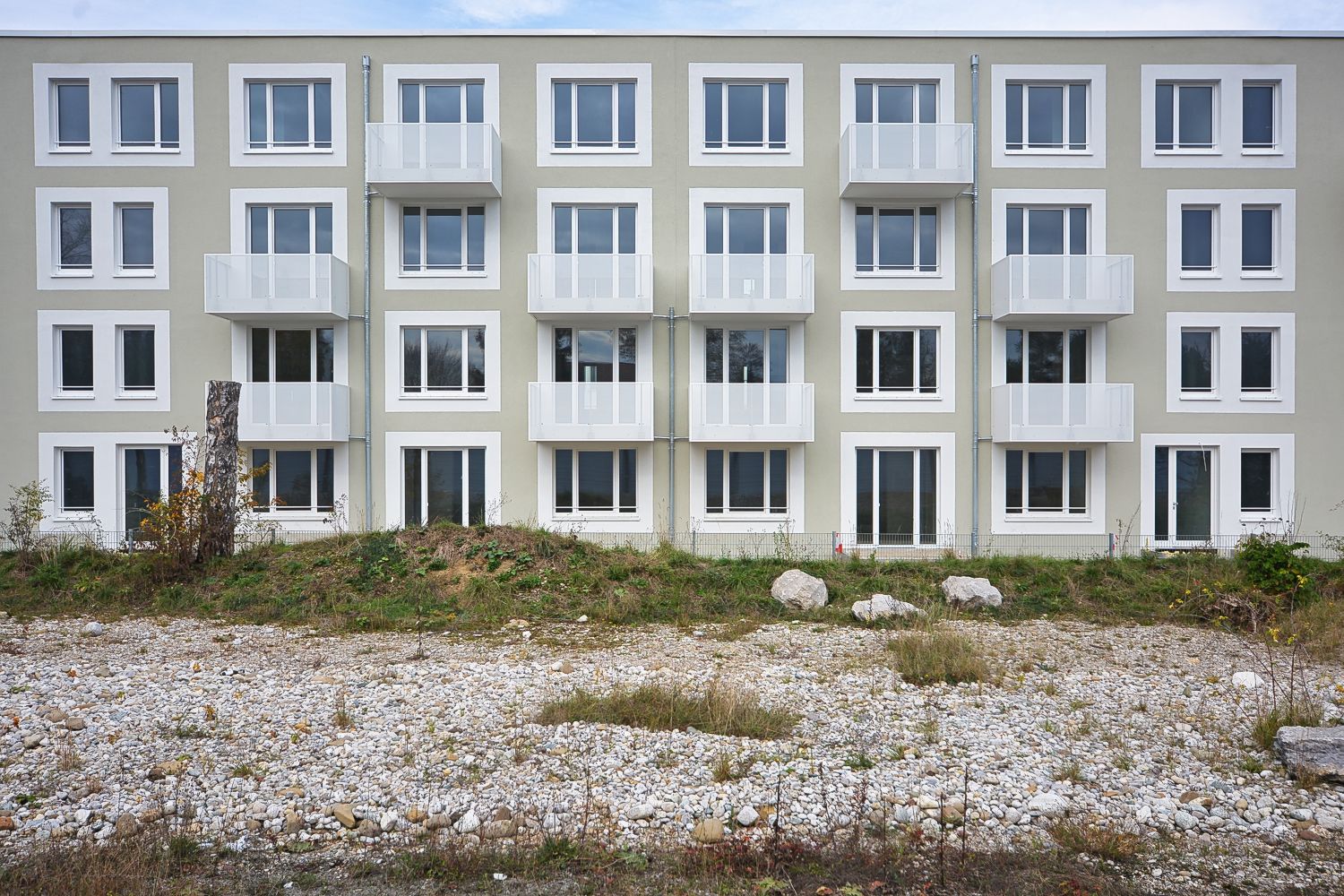 Die Bebauung verläuft parallel zur S-Bahn-Trasse. Zwischen Gebäude und Bahn liegt eine Ausgleichsfläche mit Lärmschutzwand – ein Puffer, der Abstand schafft und zugleich einen eigenständigen Freiraum ausbildet. Die geknickte Zeilenstruktur reagiert auf die Situation und differenziert die Außenräume weiter aus.