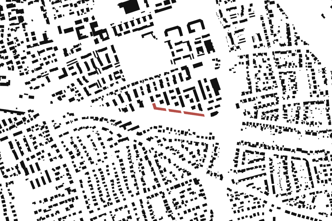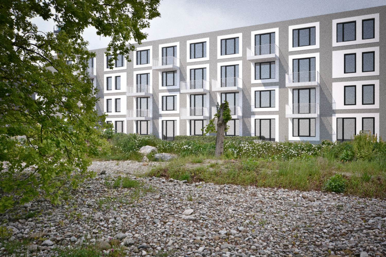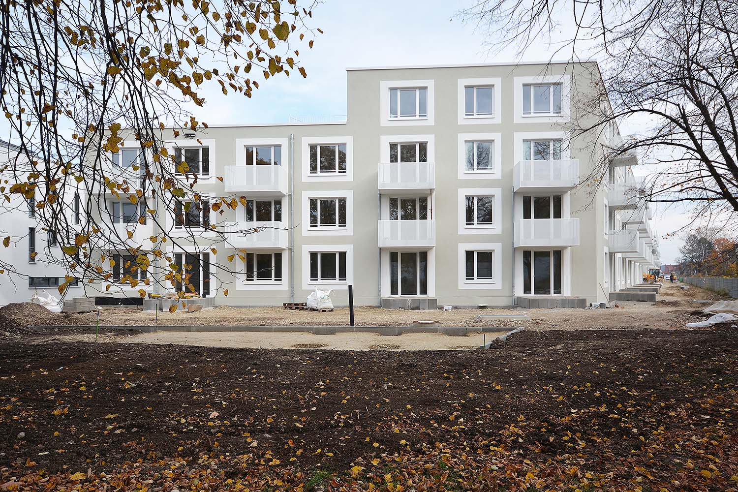 Die Bebauung verläuft parallel zur S-Bahn-Trasse. Zwischen Gebäude und Bahn liegt eine Ausgleichsfläche mit Lärmschutzwand – ein Puffer, der Abstand schafft und zugleich einen eigenständigen Freiraum ausbildet. Die geknickte Zeilenstruktur reagiert auf die Situation und differenziert die Außenräume weiter aus.
