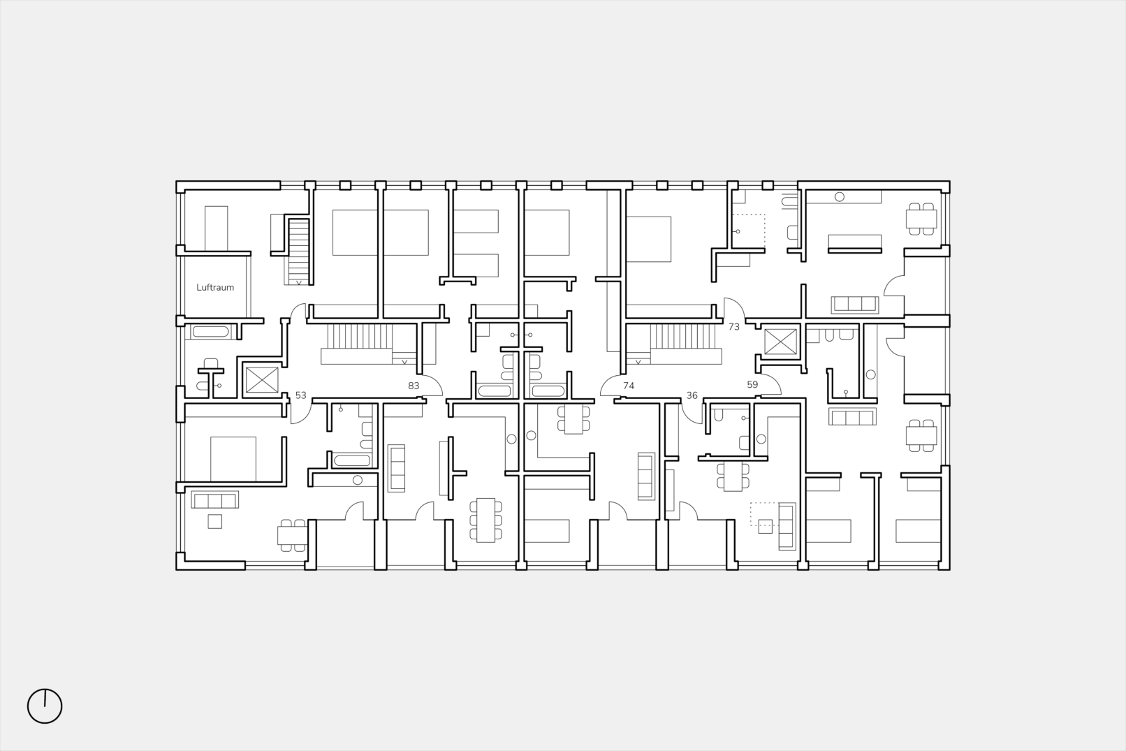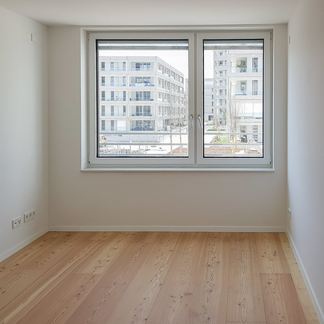 Die Grundrisse sind klar organisiert und folgen einer wiederkehrenden Struktur. Unterschiedliche Wohnungstypen lassen sich so wirtschaftlich realisieren und zugleich gut nutzen. Ergänzt wird das Spektrum durch zwei freifinanzierte Maisonettewohnungen, die innerhalb der klaren Systematik zusätzliche räumliche Qualität bieten. Loggien schaffen einen geschützten Außenbezug.
