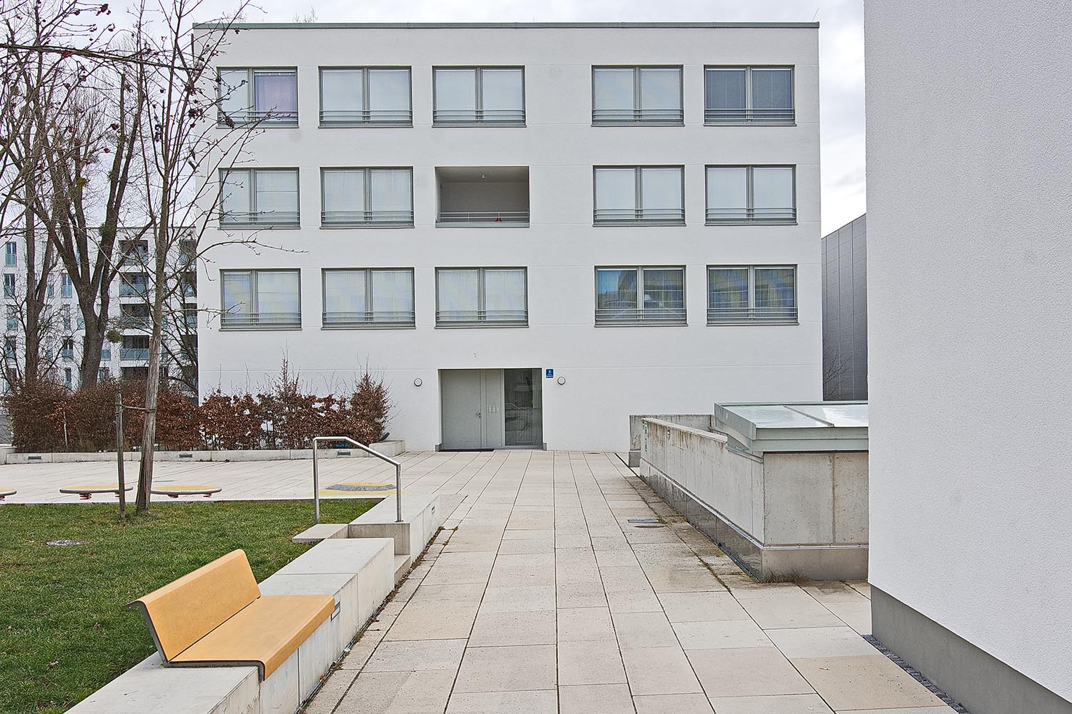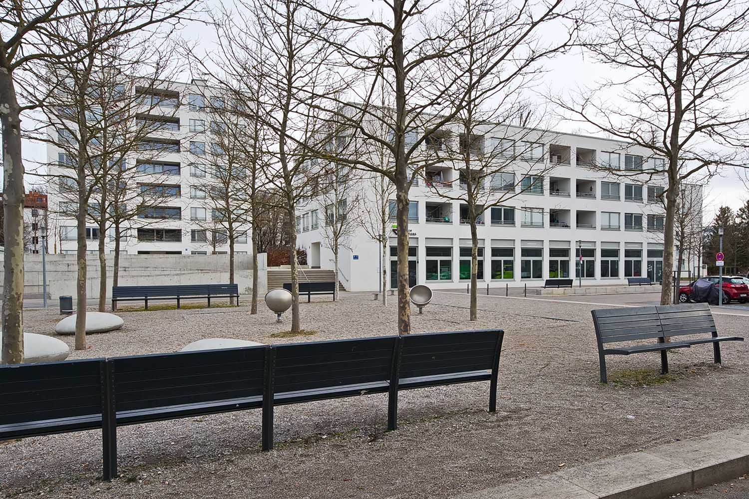 Die Erschließung der Wohnungen erfolgt über die höher liegende Esplanade. So entstehen ruhige Zugänge abseits des Platzes und eine eindeutige Trennung zwischen öffentlicher und privater Nutzung.