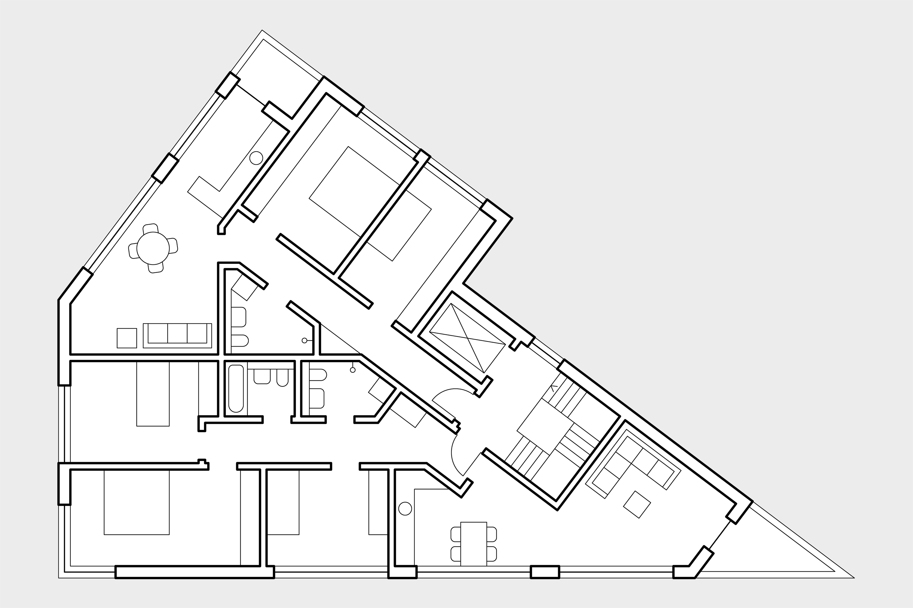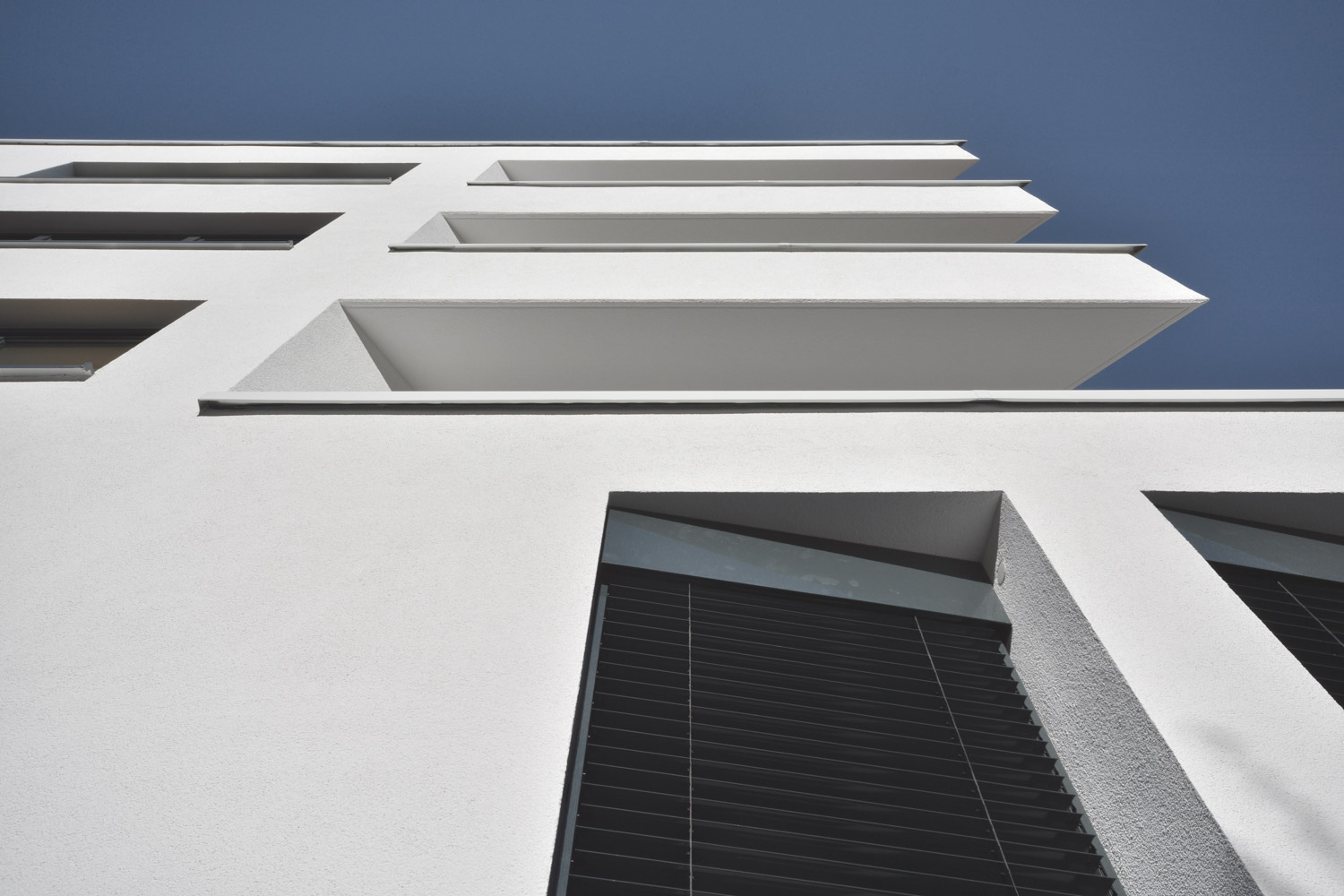 Im Erdgeschoss sind gewerbliche Nutzungen angeordnet, darüber befinden sich elf geförderte Wohnungen. Die Grundrisse entwickeln sich aus der Grundstücksform und bieten trotz der komplexen Randbedingungen gut nutzbare, differenziert organisierte Wohnräume. Balkone und Loggien sind in die plastische Gebäudeform eingeschnitten und erweitern die Wohnungen nach außen. Gleichzeitig schaffen sie Distanz zum Straßenraum und tragen mit ihren geschlossenen Brüstungen zu einer ruhigen Fassadenwirkung bei.