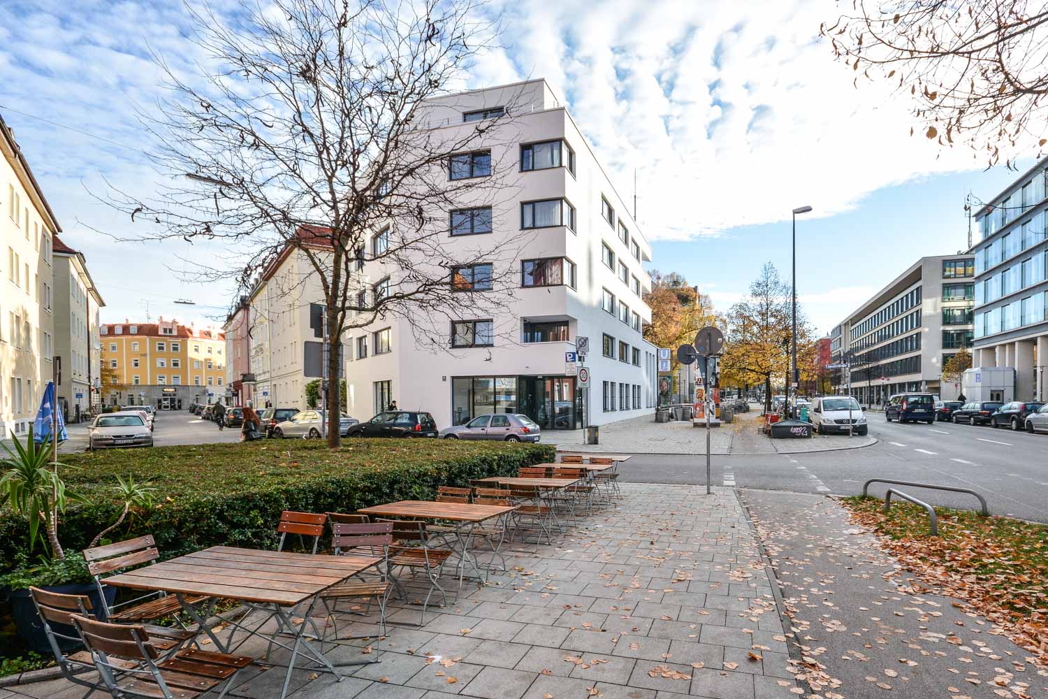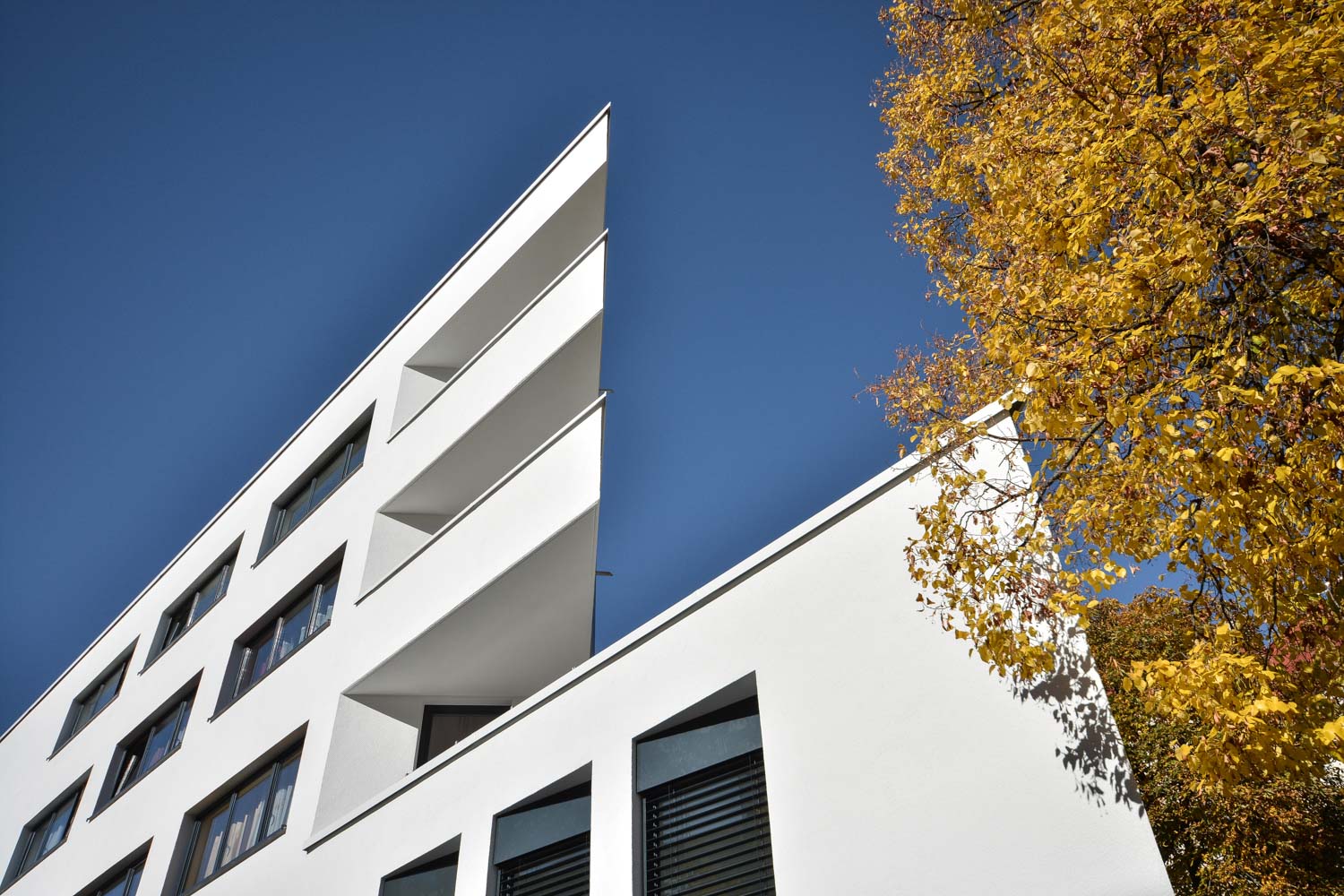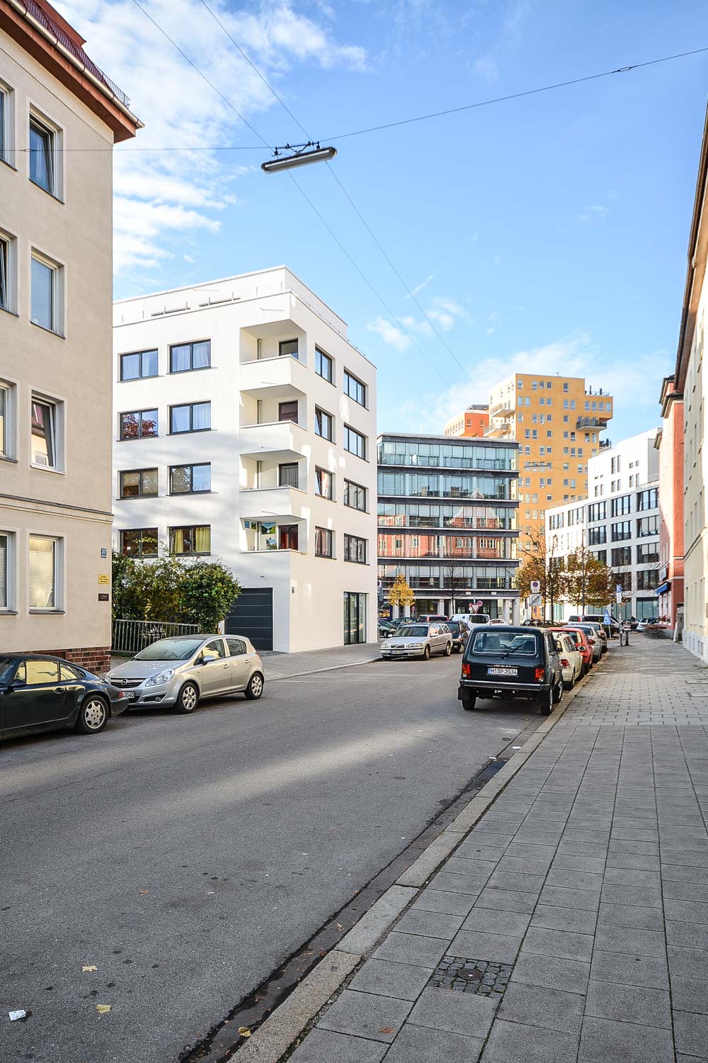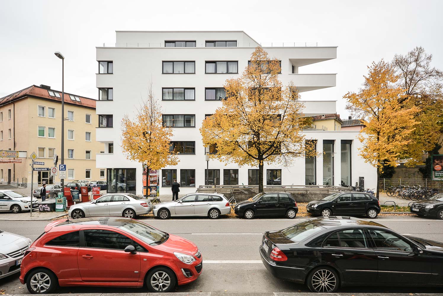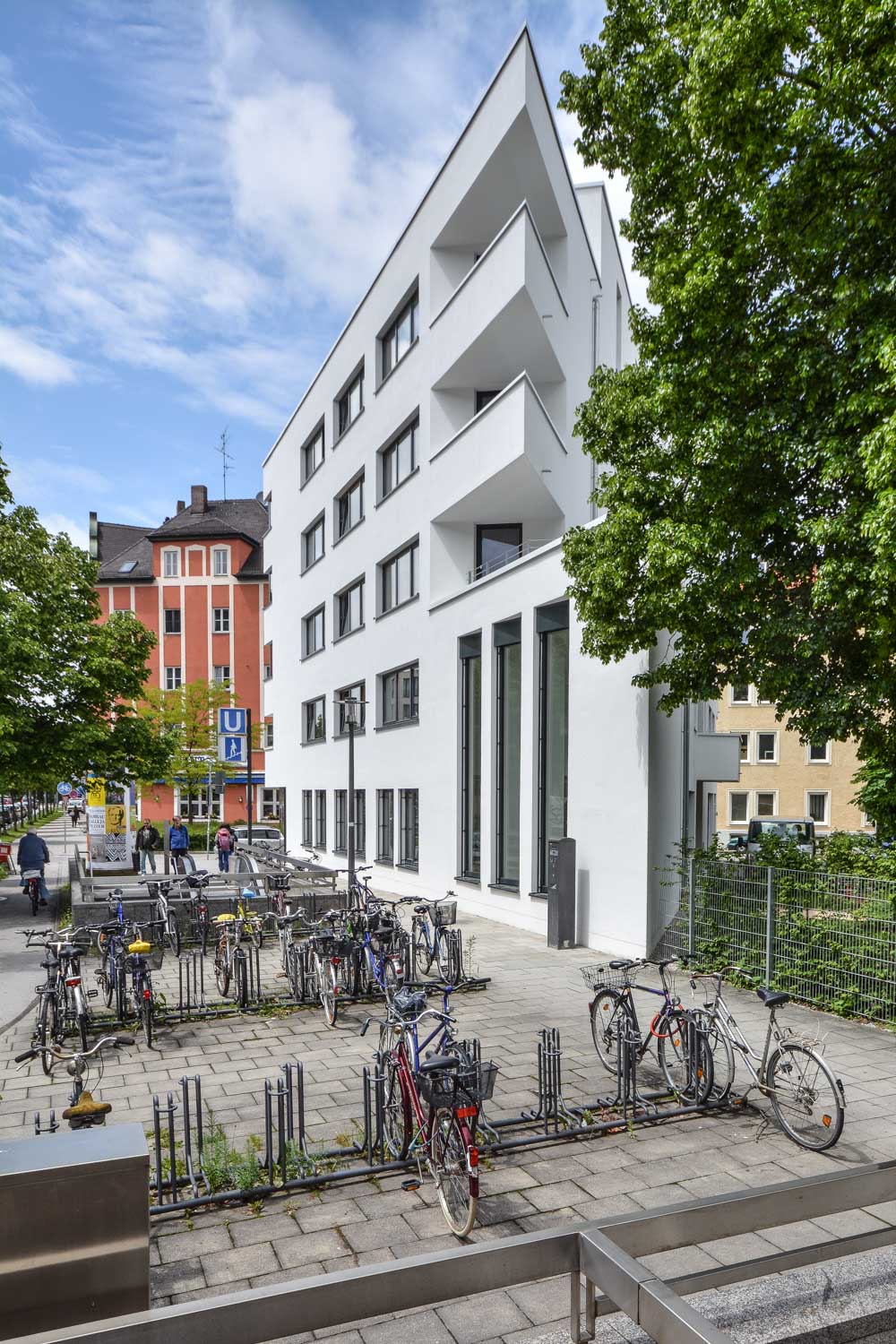 Das Wohngebäude entstand auf einem spitz zulaufenden Grundstück im innerstädtischen Kontext der Theresienwiese. Die besondere Geometrie sowie baurechtliche Vorgaben und der Erhalt von Bestandsbäumen bestimmten die Setzung und Ausbildung des Baukörpers.