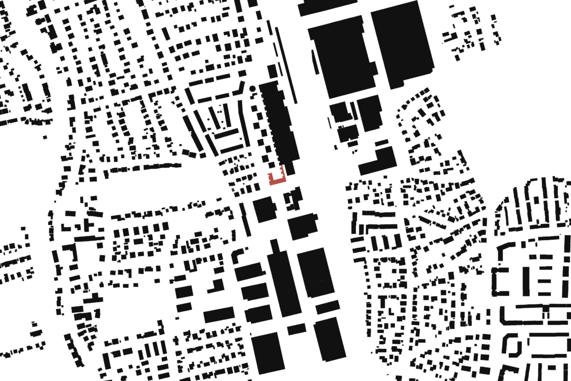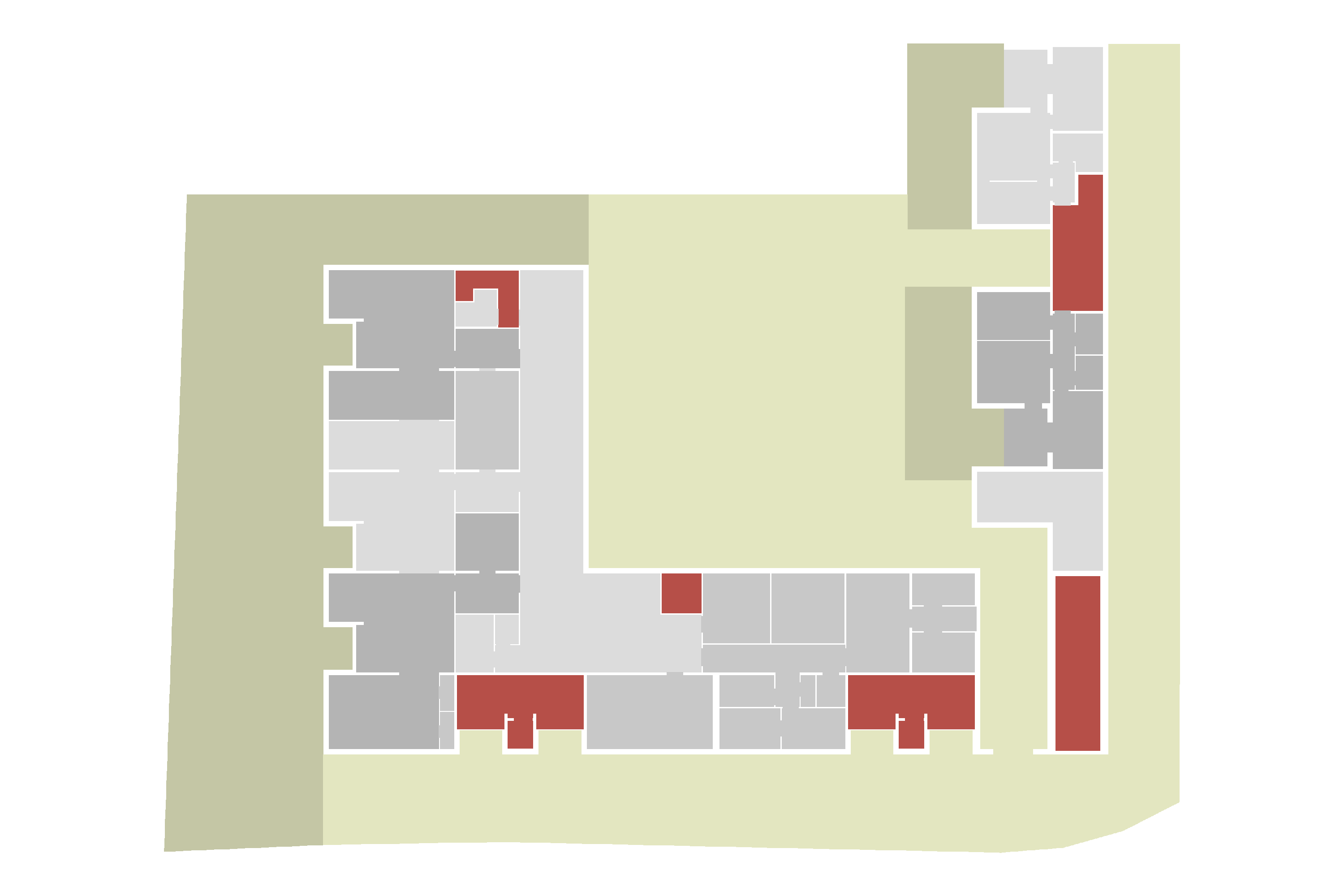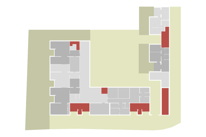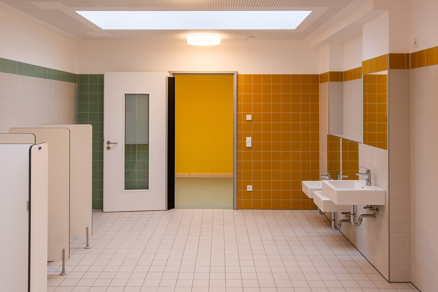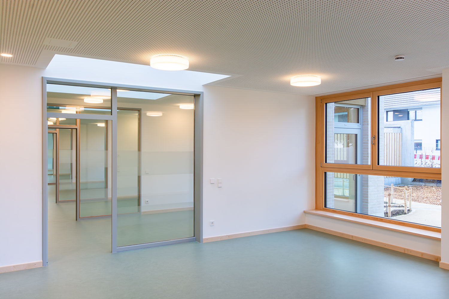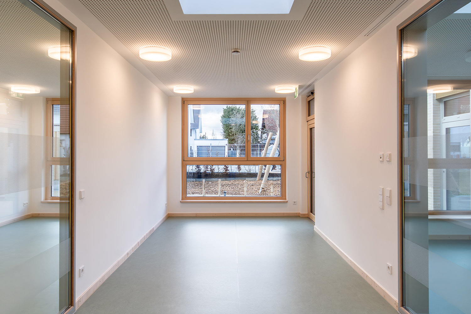 Der Zugang zur Kita liegt deshalb im ruhigen Innenhof – fern vom Straßenraum. Hier treffen sich Eltern, hier beginnt und endet der Tag. Durch große Fenster ist der Spielflur bereits von außen präsent: ein heller, verbindender Raum, der die drei Gruppenräume zusammenhält und sich im Alltag zum gemeinsamen Ort entwickelt hat – zum Spielen, Warten und inzwischen auch zum Essen.