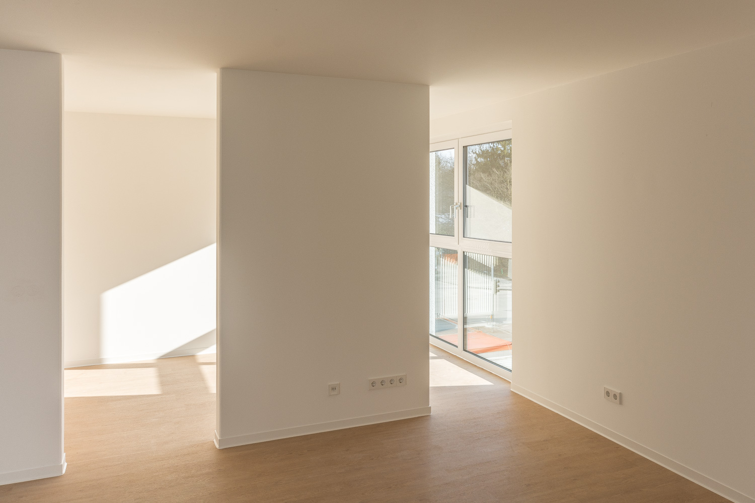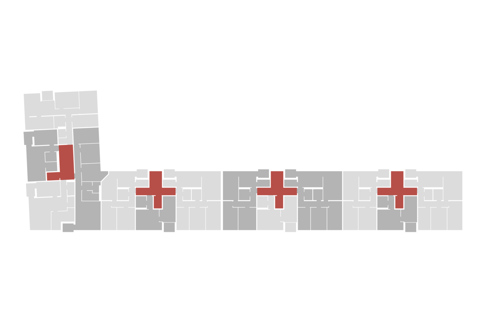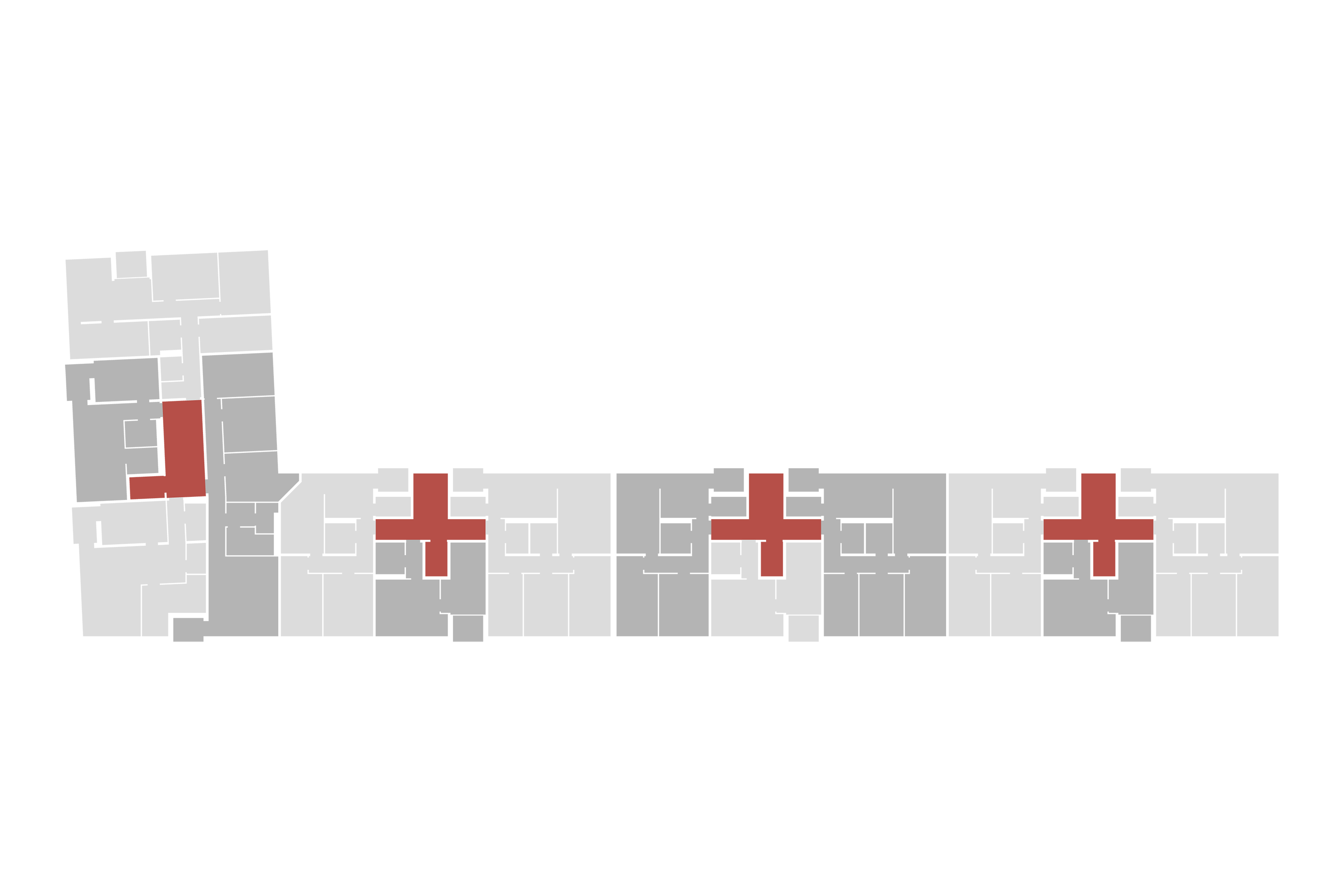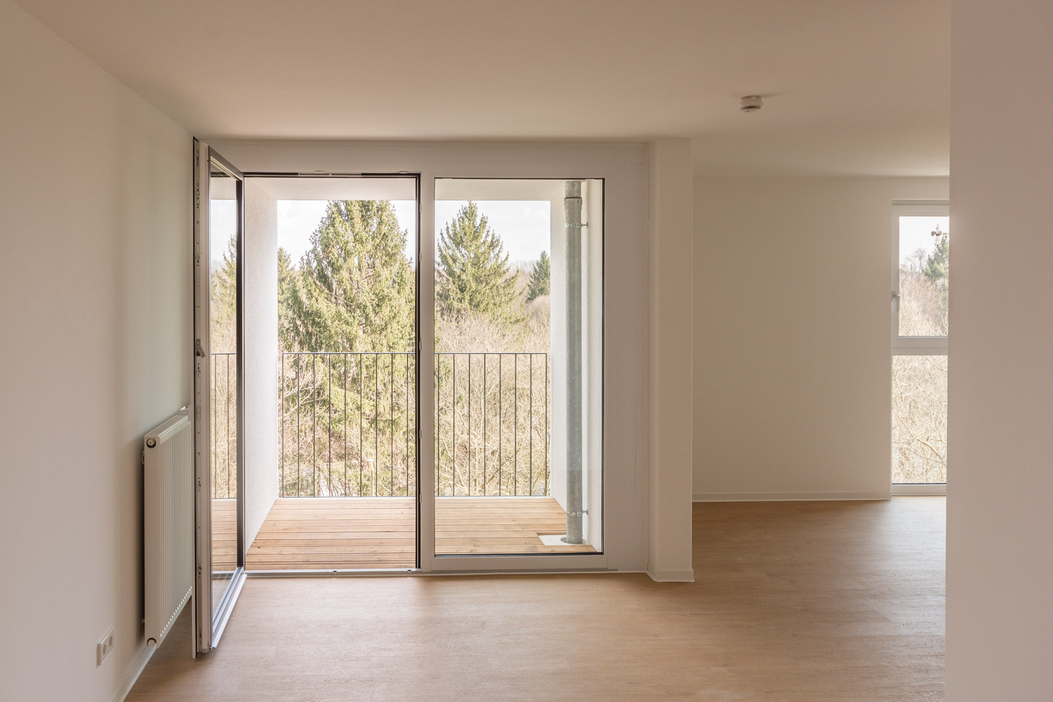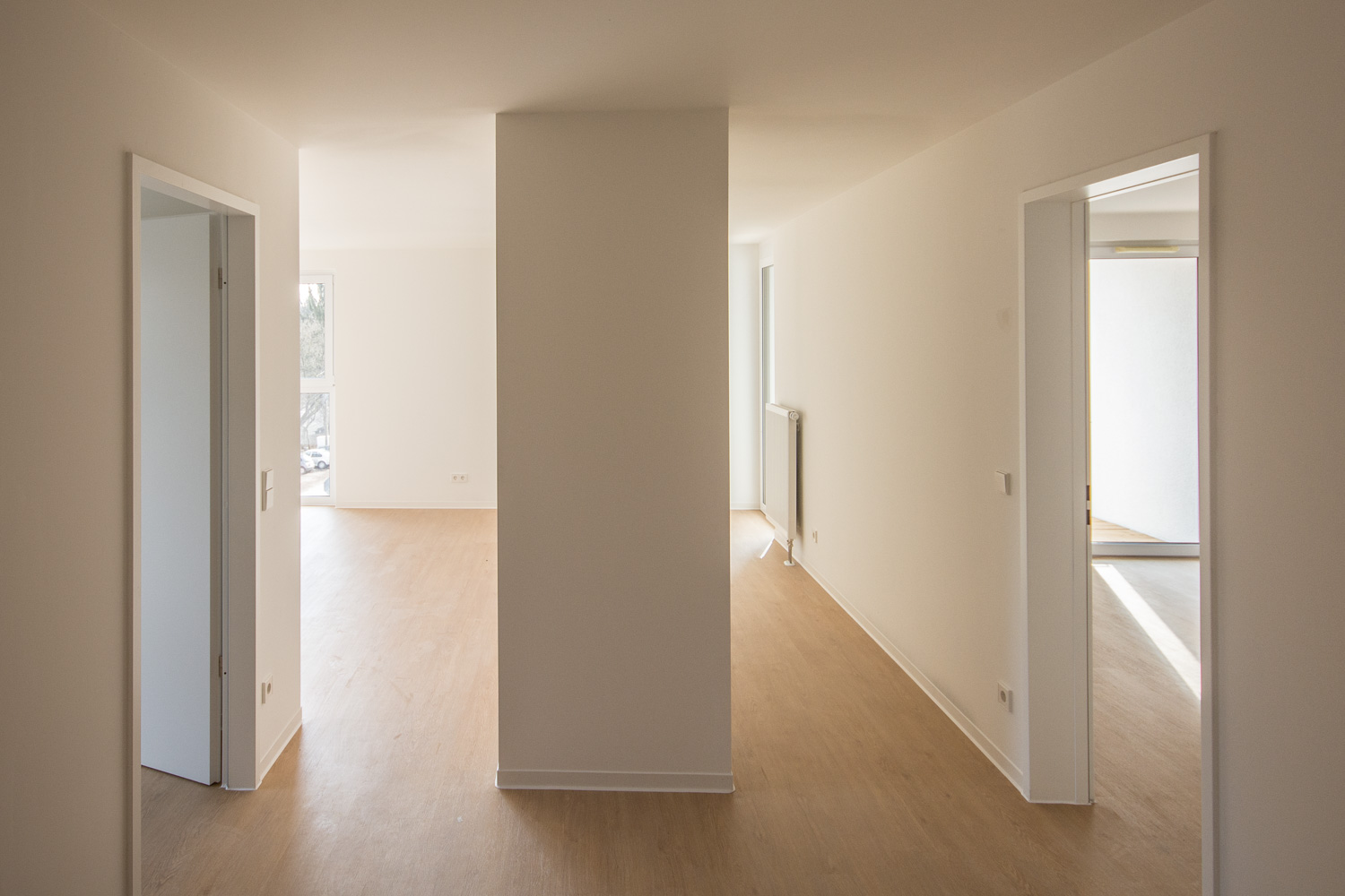 Die Grundrisse sind überwiegend um einen kompakten Sanitärkern organisiert, der als räumliches Zentrum der Wohnungen wirkt. Umlaufend erschließbare Räume stehen in vielfältigen Beziehungen zueinander. So entstehen fließende Raumfolgen, die die Wohnung als zusammenhängenden Raum erfahrbar machen.