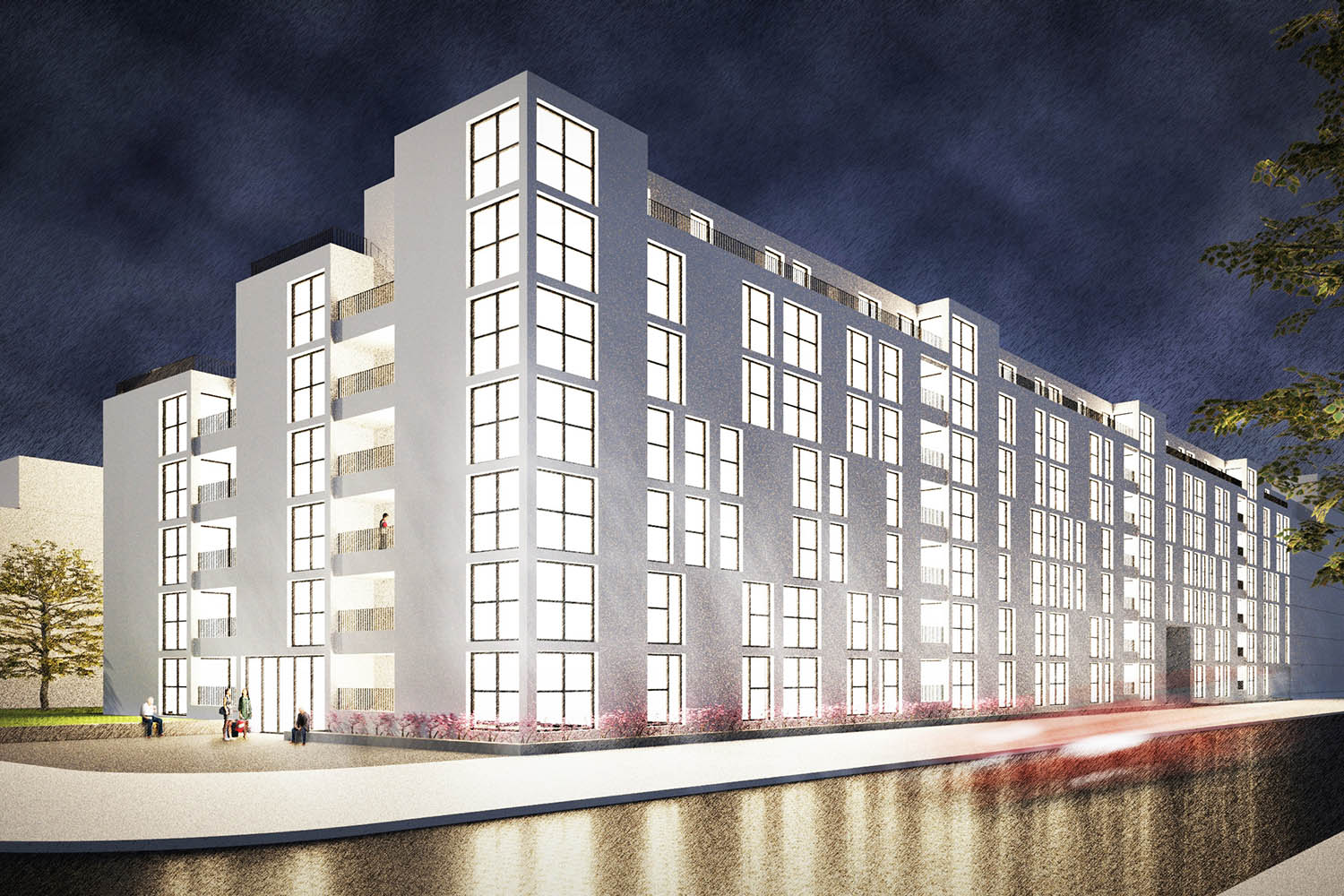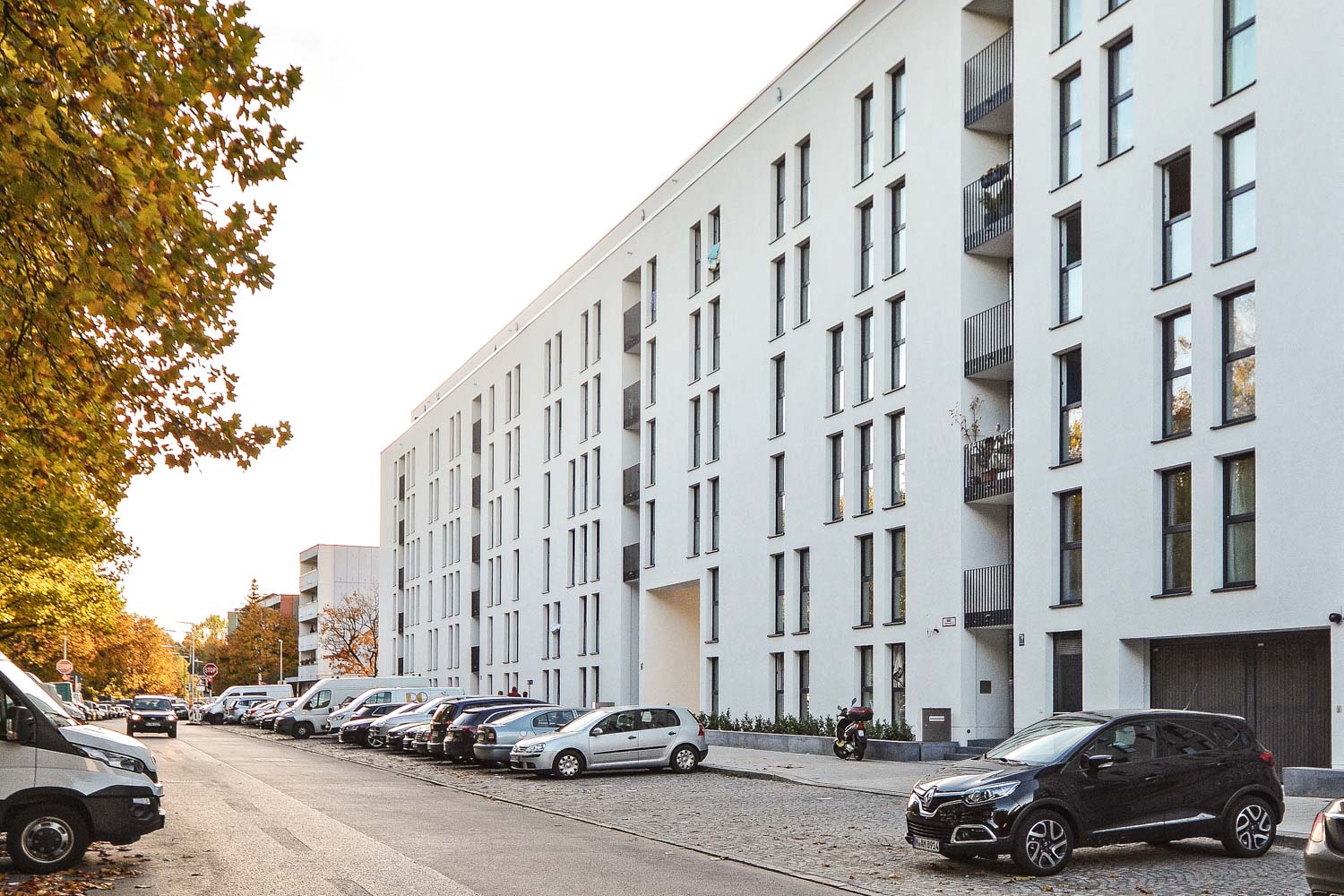 Zur Straße hin entsteht eine klare, ruhige Kante. Präzise gegliederte Fassaden mit gleichmäßigen Fensterformaten und zurückhaltend eingeschnittenen Balkonen prägen das Erscheinungsbild. Die Straßenfassade ist direkt auf den Weißenseepark ausgerichtet und ermöglicht weite Ausblicke.