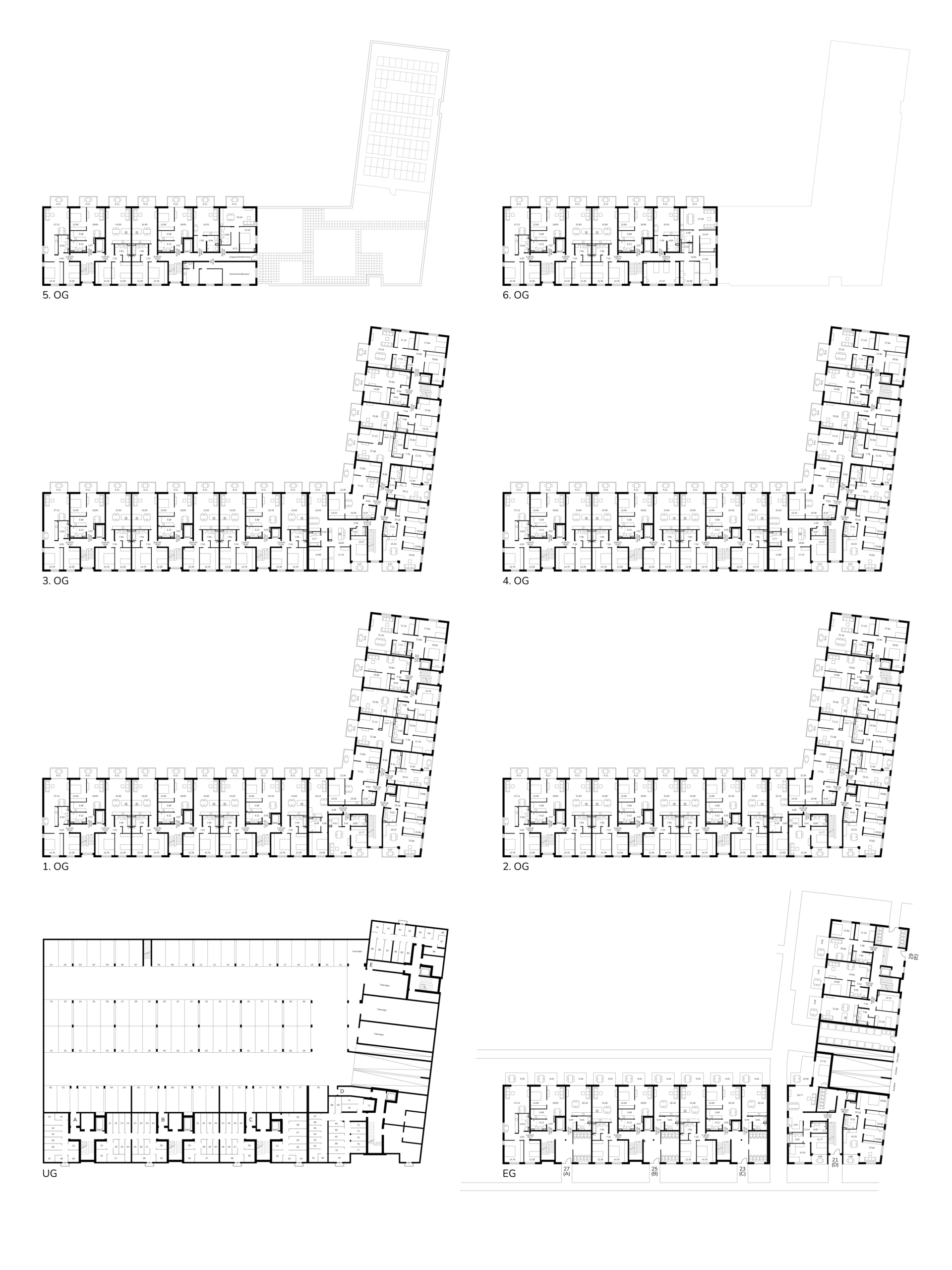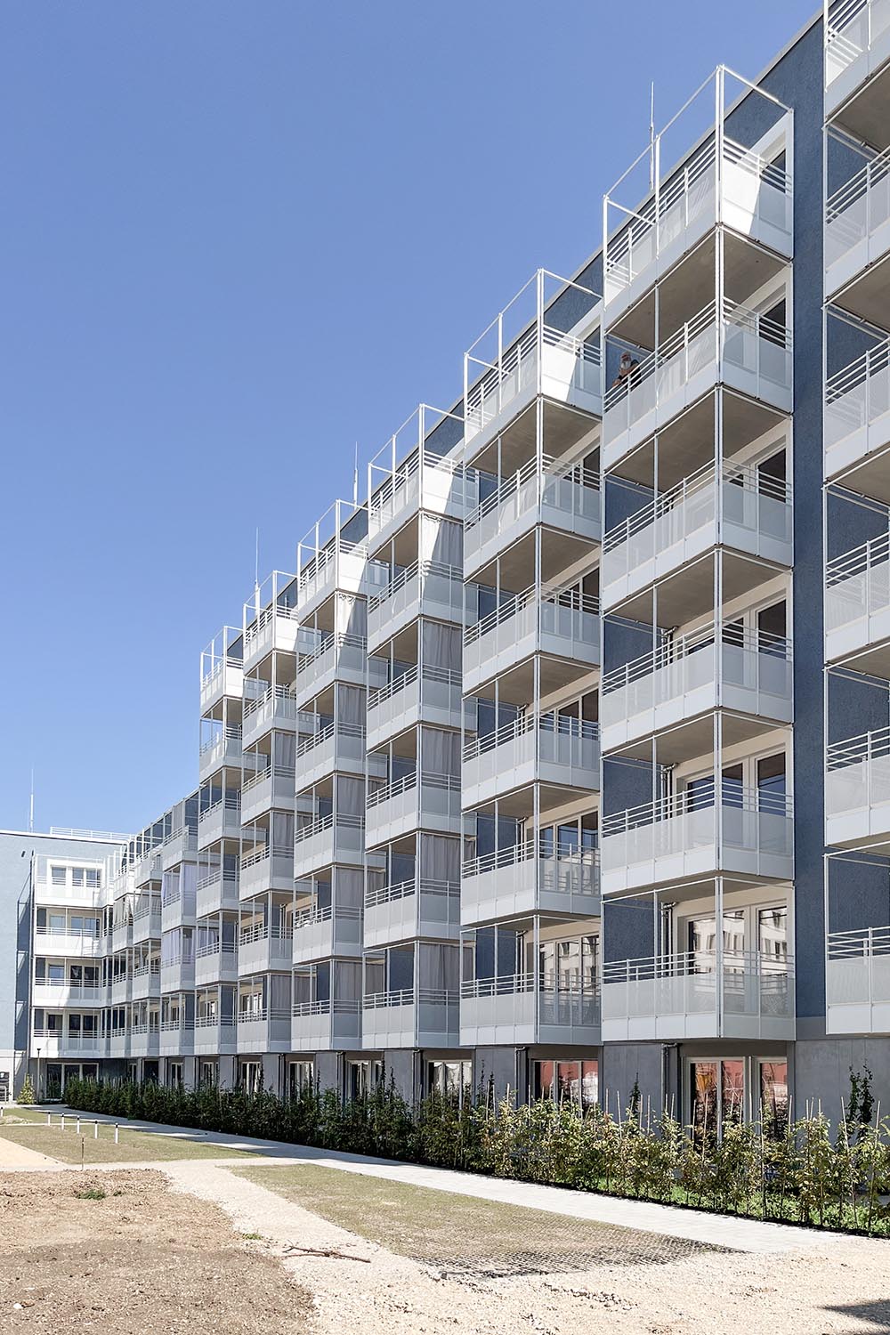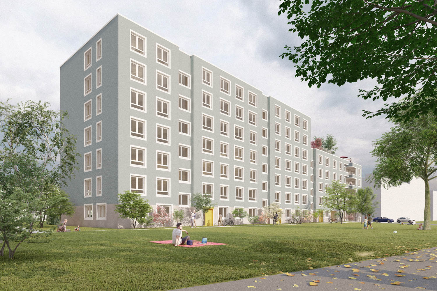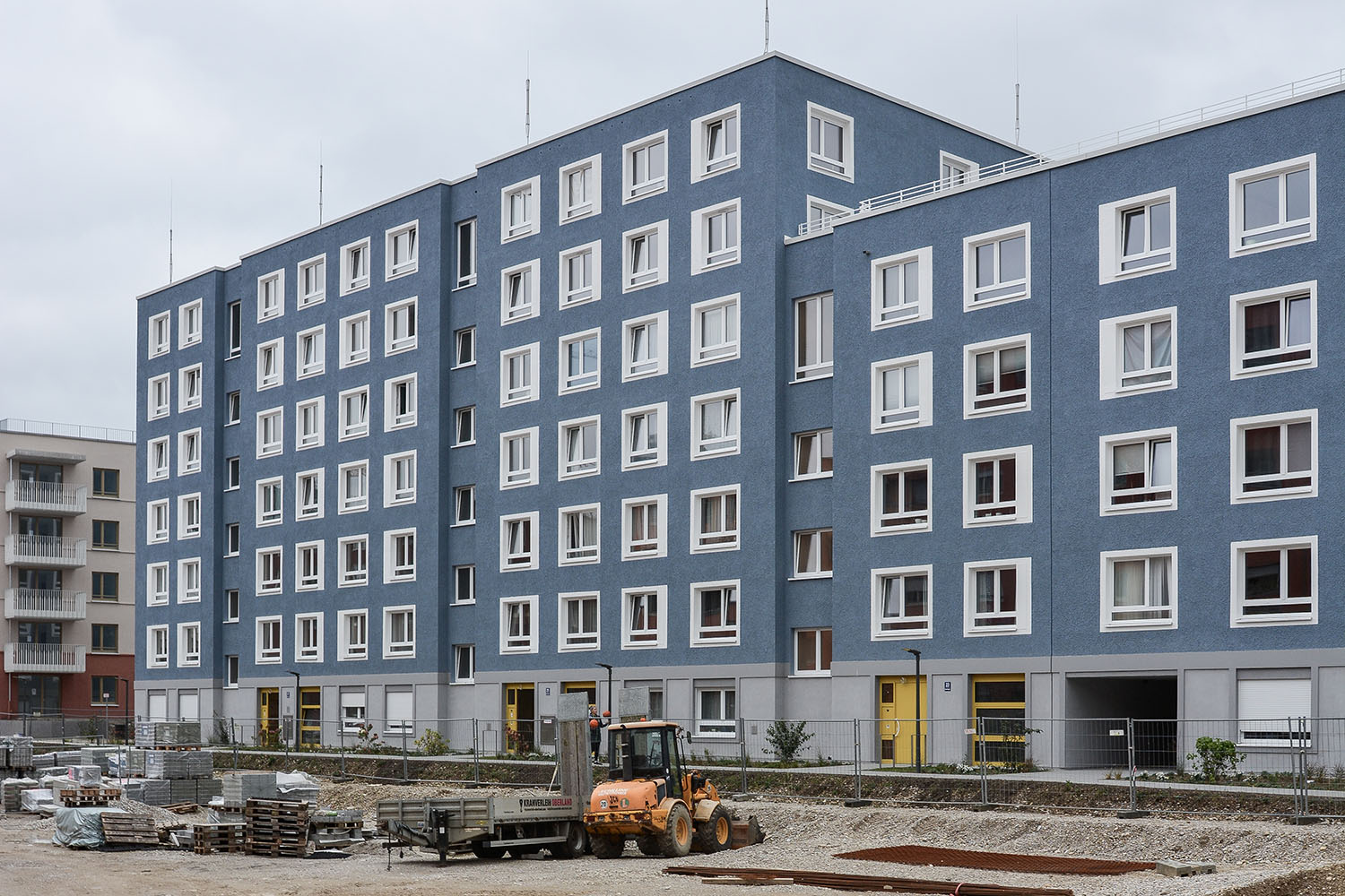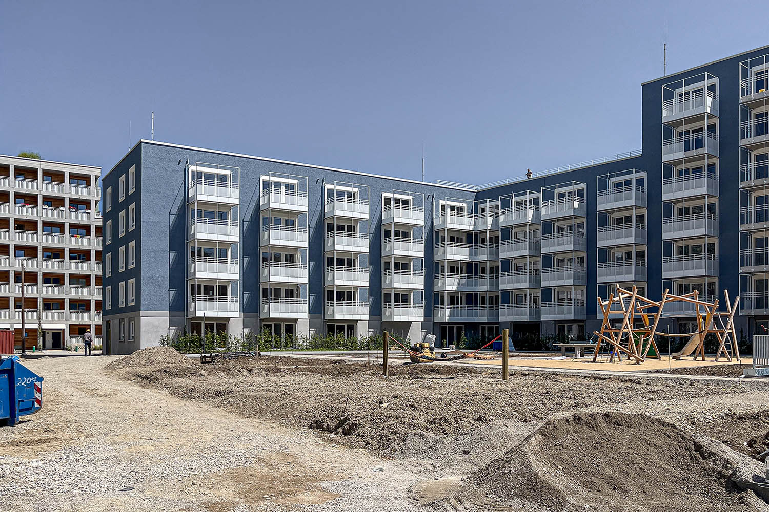 Nach unserem ersten Projekt im WA 15 kam gleich das zweite im WA 17. Wieder preisgedämpfter Mietwohnungsbau mit begrenzten Mitteln und hohem Kostendruck. Unsere Antwort war ein klarer und effizienter Entwurf, konventionell gebaut ohne serielle Vorfertigung und trotzdem sehr schnell. Die zu errichtende Geschossfläche und die engen Vorgaben des B-Plans ließen keinen Spielraum für Variationen des Baukörpers. So musste das Haus in voller tiefe und ohne Unterbrechung um die Ecke geführt werden. Man wünscht sich eigentlich mehr Freiheiten, aber in Sachen Baukosten und Energieeffizienz sind solche Einschränkungen ein großer Gewinn.