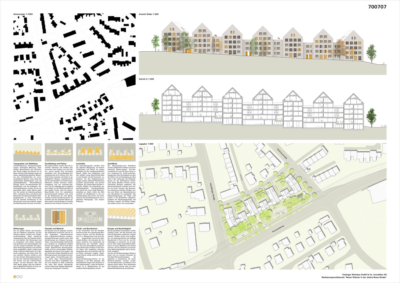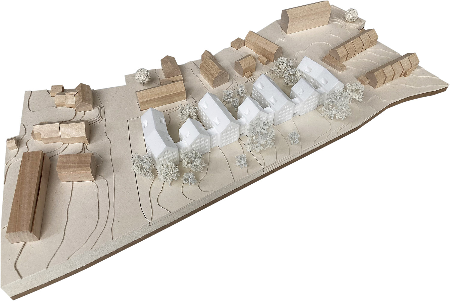 Verkehrsbelastung, Hochspannungsleitungen, heterogene Bebauung, reichhaltiger Baumbestand und abschüssiges Terrain prägen den Genius loci. In dieser diffusen Gemengelage zeigen die sieben giebelständig gesetzten Baukörper den Vorbeifahrenden ein unverwechselbares Gesicht, wozu neben der rhythmischen Giebelsequenz auch die geländeabbildende Höhenstaffelung beiträgt. Durch die alternierenden Gebäudelängen und die niedrigeren Verbindungsbaukörper werden auf der abgewandten Seite ruhige Räume gebildet. Sie werden als dreiseitig gefasste Höfe wahrgenommen und dienen den Bewohnern als gemeinschaftliche Übergangsbereiche zu ihren Wohnungen. Auf die bauliche Annäherung an die Stromtrasse wird unter anderem wegen des Baumbestands bewusst verzichtet.