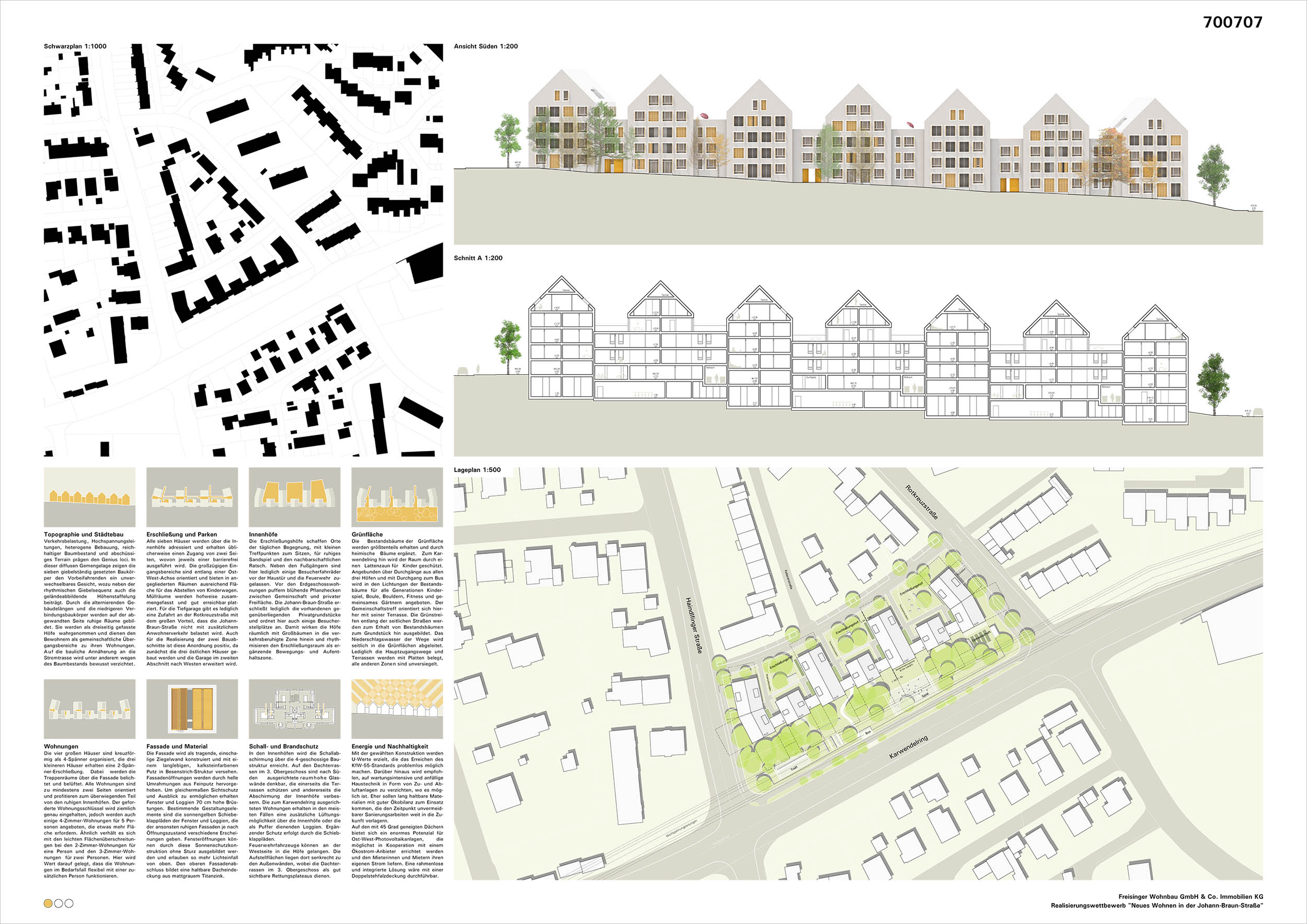 Die Erschließungshöfe schaffen Orte der täglichen Begegnung, mit kleinen Treffpunkten zum Sitzen, für ruhiges Sandspiel und den nachbarschaftlichen Ratsch. Neben den Fußgängern sind hier lediglich einige Besucherfahrräder vor der Haustür und die Feuerwehr  zugelassen. Vor den Erdgeschosswohnungen puffern blühende Pflanzhecken zwischen Gemeinschaft und privater Freifläche. Die Johann-Braun-Straße erschließt lediglich die vorhandenen gegenüberliegenden Privatgrundstücke und ordnet hier auch einige Besucherstellplätze an. Damit wirken die Höfe räumlich mit Großbäumen in die verkehrsberuhigte Zone hinein und rhythmisieren den Erschließungsraum als ergänzende Bewegungs- und Aufenthaltszone.