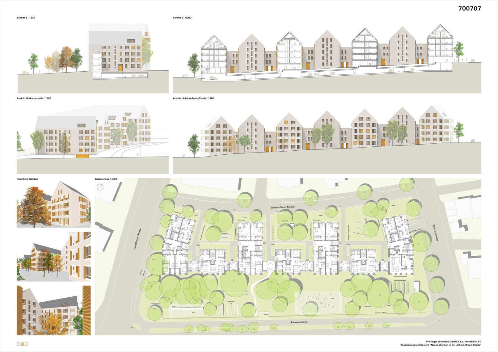 Alle sieben Häuser werden über die Innenhöfe adressiert und erhalten üblicherweise einen Zugang von zwei Seiten, wovon jeweils einer barrierefrei ausgeführt wird. Die großzügigen Eingangsbereiche sind entlang einer Ost-West-Achse orientiert und bieten in angegliederten Räumen ausreichend Fläche für das Abstellen von Kinderwagen. Müllräume werden hofweise zusammengefasst und gut erreichbar platziert. Für die Tiefgarage gibt es lediglich eine Zufahrt an der Rotkreuzstraße mit dem großen Vorteil, dass die Johann-Braun-Straße nicht mit zusätzlichem Anwohnerverkehr belastet wird. Auch für die Realisierung der zwei Bauabschnitte ist diese Anordnung positiv, da zunächst die drei östlichen Häuser gebaut werden und die Garage im zweiten Abschnitt nach Westen erweitert wird.