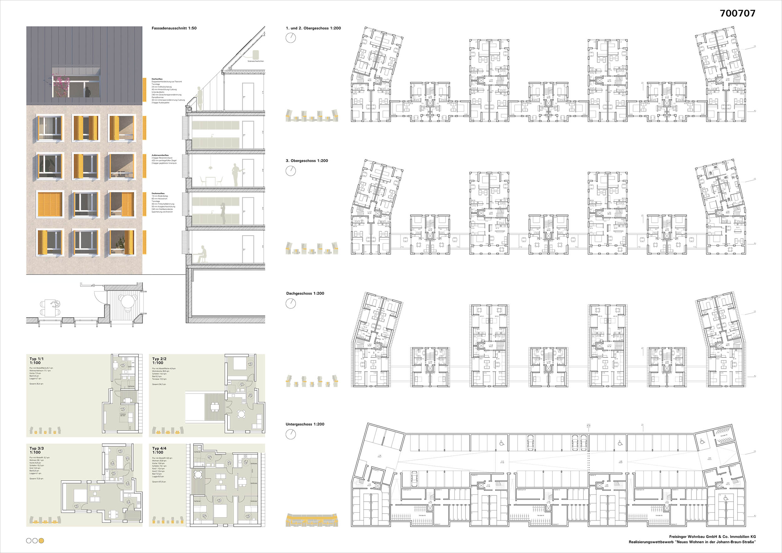 Die vier großen Häuser sind kreuzförmig als 4-Spänner organisiert, die drei kleineren Häuser erhalten eine 2-Spänner-Erschließung. Dabei werden die Treppenräume über die Fassade belichtet und belüftet. Alle Wohnungen sind zu mindestens zwei Seiten orientiert und profitieren zum überwiegenden Teil von den ruhigen Innenhöfen. Der geforderte Wohnungsschlüssel wird ziemlich genau eingehalten, jedoch werden auch einige 4-Zimmer-Wohnungen für 5 Personen angeboten, die etwas mehr Fläche erfordern. Ähnlich verhält es sich mit den leichten Flächenüberschreitungen bei den 2-Zimmer-Wohnungen für eine Person und den 3-Zimmer-Wohnungen für zwei Personen. Hier wird Wert darauf gelegt, dass die Wohnungen im Bedarfsfall flexibel mit einer zusätzlichen Person funktionieren.